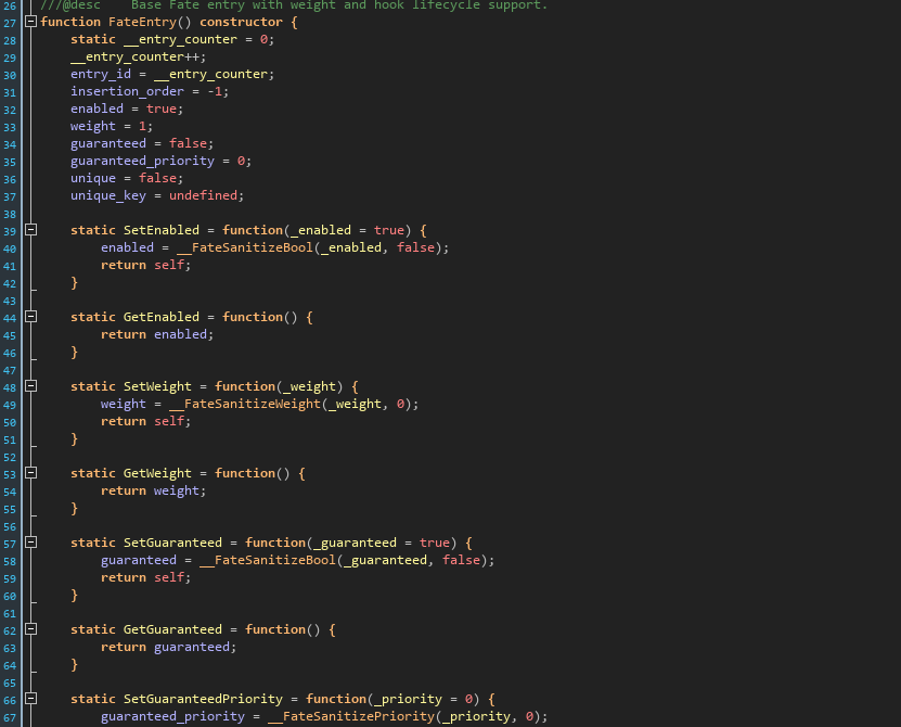 FateRollValues,FateTrackTable, snapshot helpers) to avoid advanced plumbing early. - Core entry controls: Weighted, guaranteed, and unique selection primitives with chainable APIs.